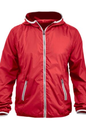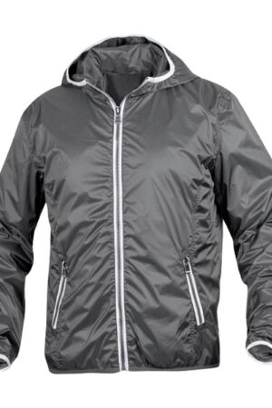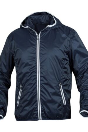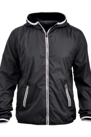 Modern windjack met opvallende contrasterende details bij de ritsen, capuchon en onderaan de mouwen.