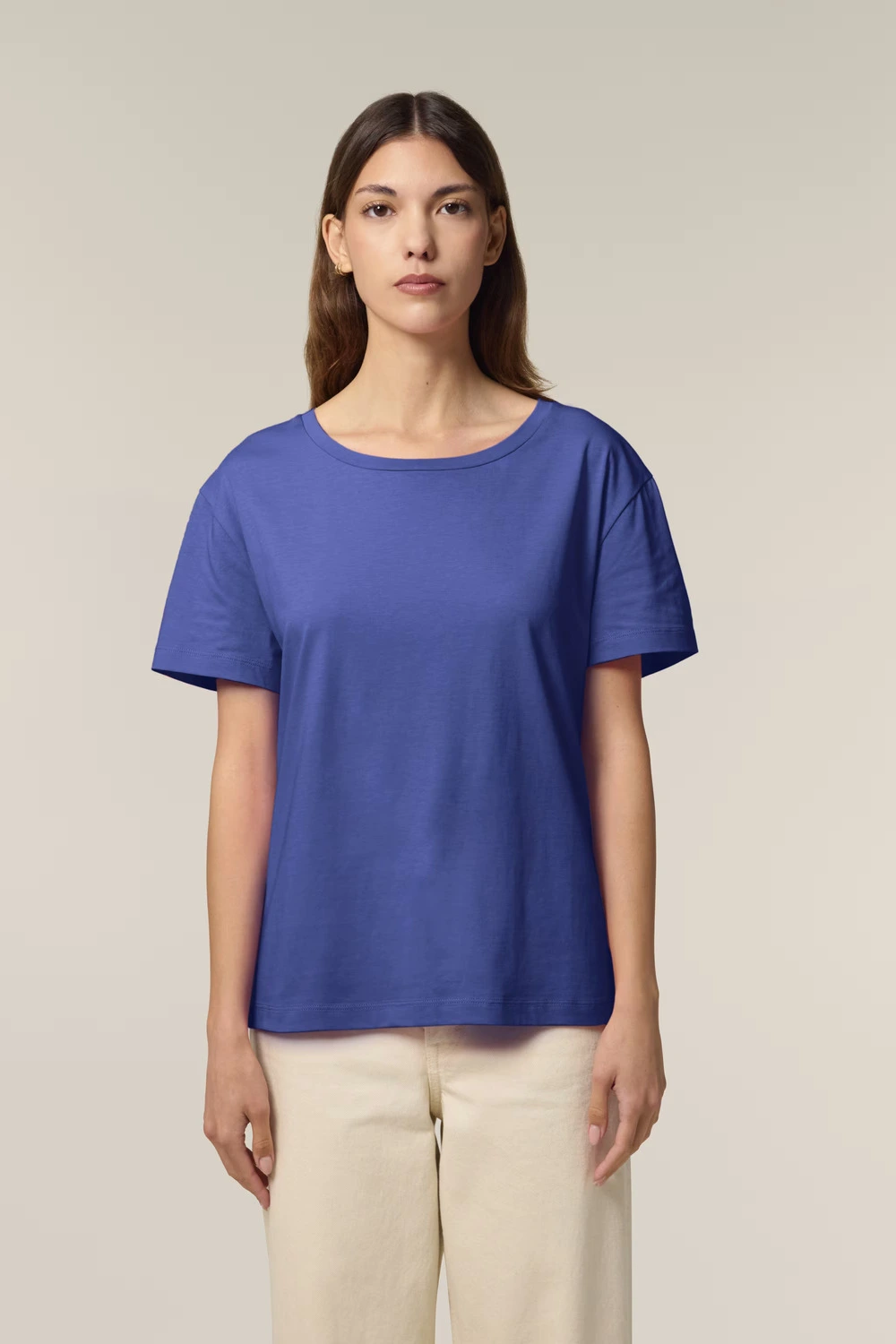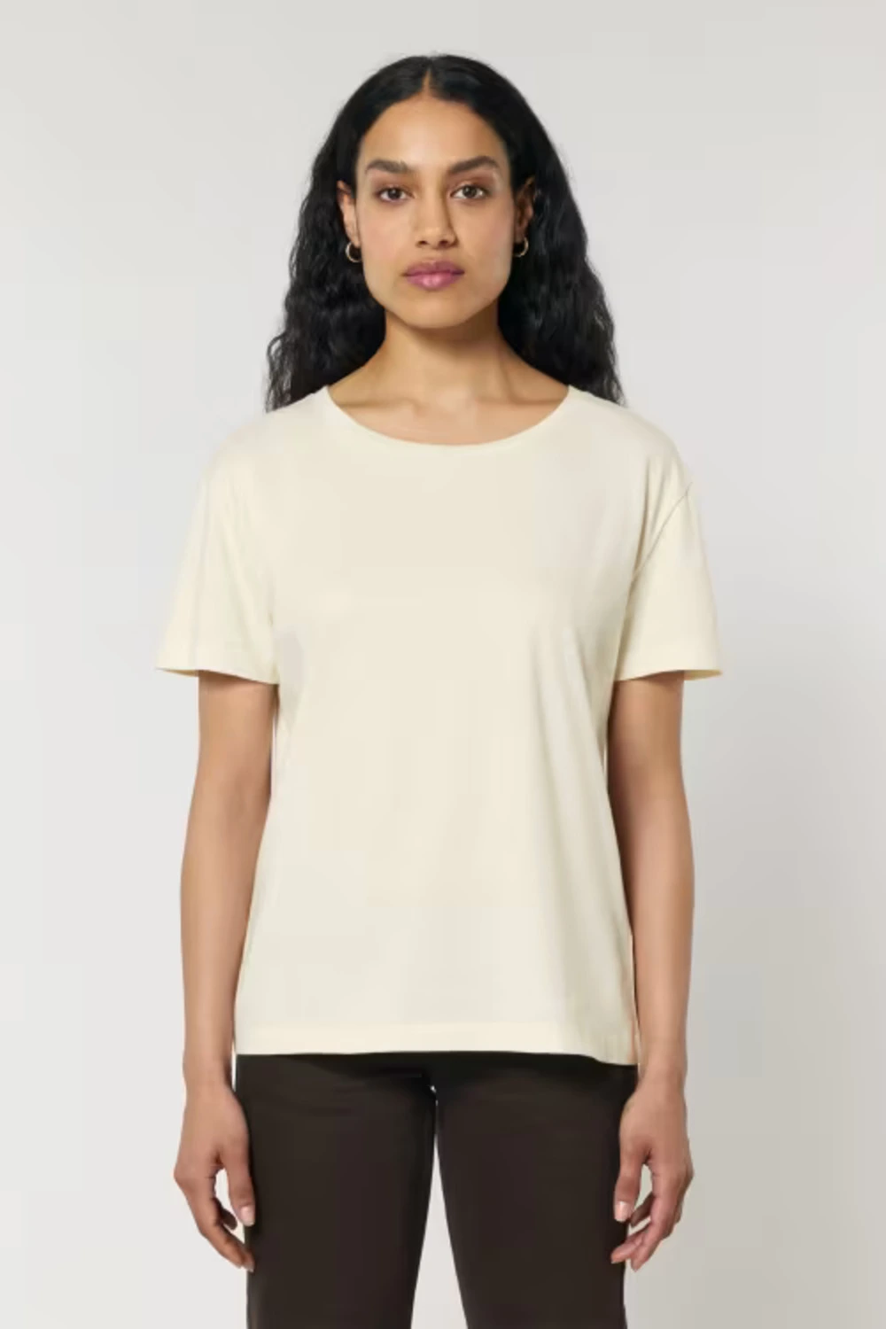 De Stella Serena is een dames T-shirt met een zachte, subtiele uitstraling en een flatterende pasvorm. Gemaakt van 100 % organisch katoen met een lichtgewicht stof (155 g/m²), voelt dit shirt comfortabel en ademend aan — perfect voor warmer weer of als laagje onder een jasje. Het model kent een medium fit, een diepe ronde halslijn en ingezette mouwen die het silhouet subtiel begeleiden zonder te strak aan te zitten.